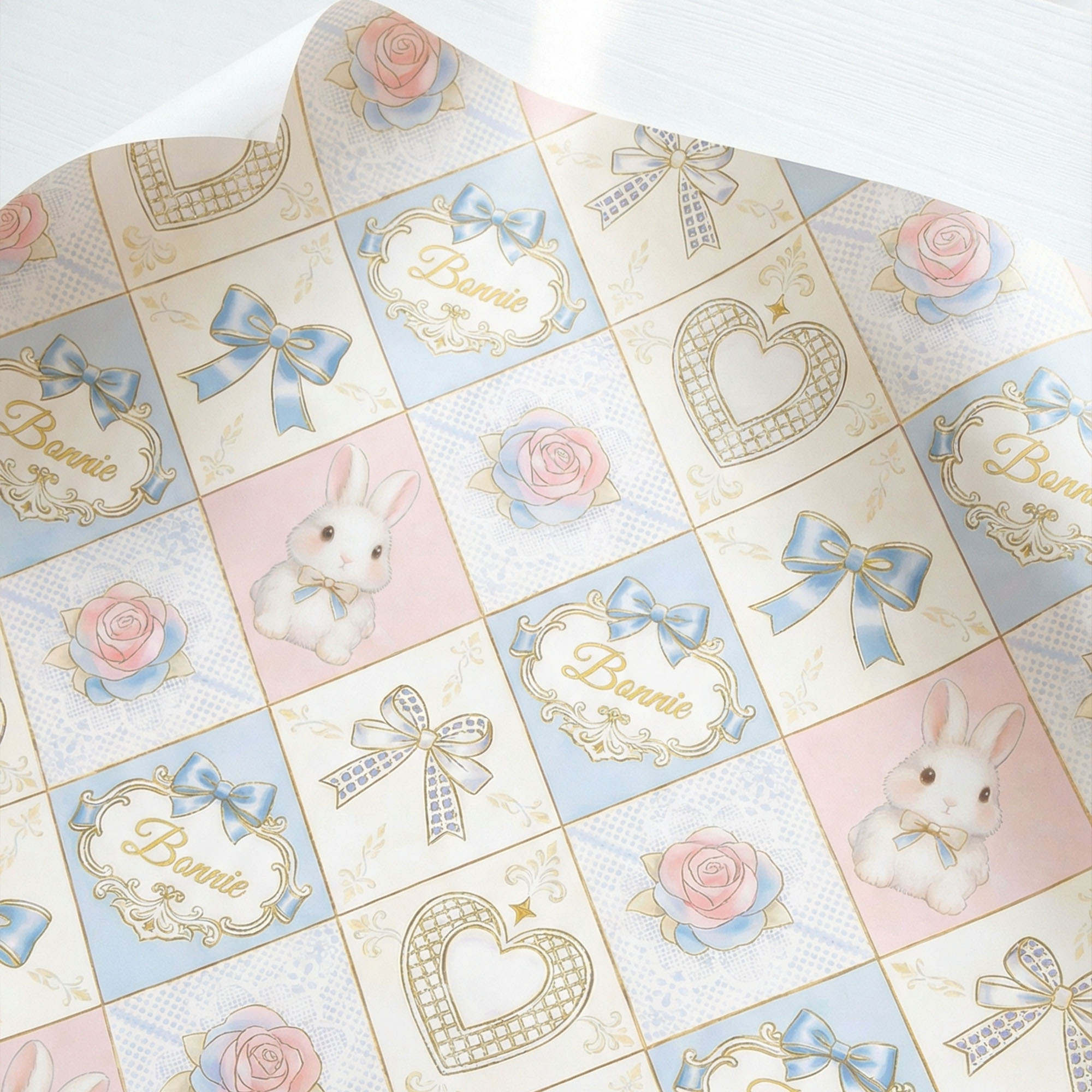 Elegant Shabby Chic Design – This charming wrapping paper features a delicate checkerboard pattern with soft pastel squares in blush pink, powder blue, and cream. Each tile is adorned with vintage-inspired elements like lace hearts, roses, bows, and sweet bunnies, creating a timeless, romantic look perfect for spring celebrations.